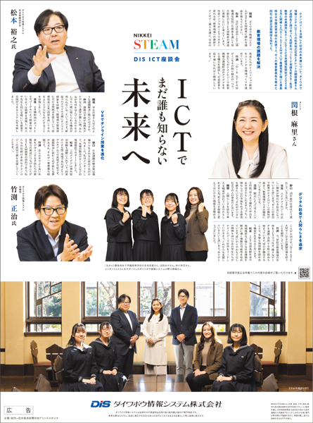 ダイワボウ情報システムはSTEAM教育推進の一環として、日本経済新聞社大阪本社主催の「日経STEAM2025シンポジウム」に特別協賛しました。この度、ダイワボウ情報システムが開催した「DIS STEAMゼミ」で最優秀賞を受賞した「豊島岡女子学園高等学校」の生徒と、『ICTを活用した生活・学びの未来探究』をテーマに座談会を行いましたので、その様子を日本経済新聞に記事広告として掲載しました。