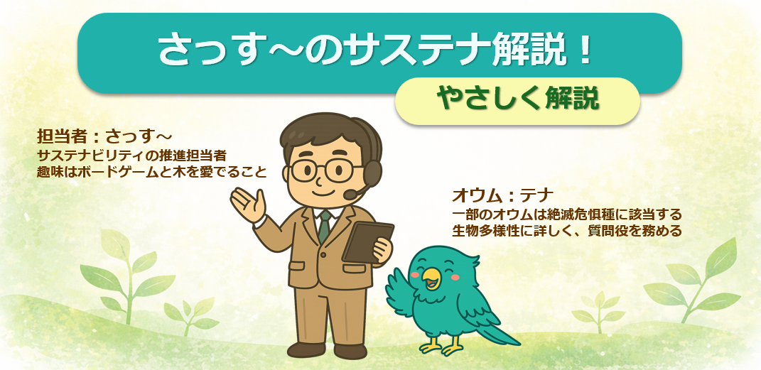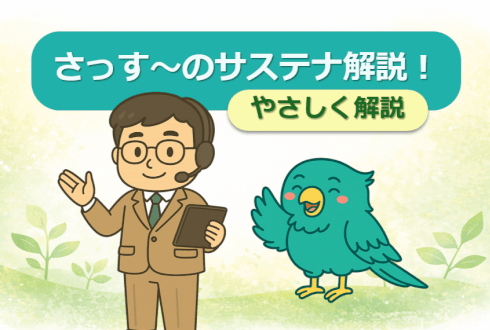 やあ、こんにちは!私は『サステナビリティ ナビ』を務める “さっす~” です。当社グループで、サステナビリティ― つまり “ビジネスで関わる人々や企業、地域社会を連携させることで、世の中の困り事を解決し、会社も持続的に成長していくことを両立させよう、という考え” を応援しているよ。これから、オウムの「テナ」と一緒に、みんなにサステナビリティについてわかりやすく紹介していくから、よろしくね!