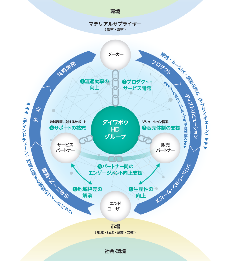当社グループの「バリューチェーン」は、製品がつくられて皆さんの手元に届くまで(サプライチェーン)と、実際に使われた皆さんの声が次の製品開発に活かされるまで(デマンドチェーン)の、大きく2つの流れで成り立っているよ。(下図参照) 私たちは単に商品を届けるだけでなく、実際に製品を使うお客様(エンドユーザー)の声や市場のトレンドをメーカーに伝えることで、もっと良い商品やサービスが生まれるようサポートしているんだ。この双方向の繋がりこそが私たちの強みであり、社会をより便利で快適にするための大切な力(原動力)になっているんだよ。 |
