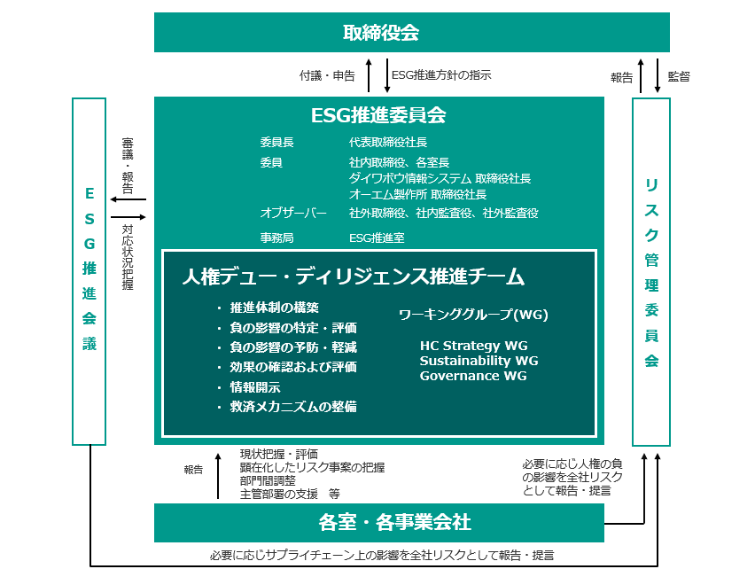 当社グループでは、代表取締役社長が委員長を務める「ESG推進委員会」を設置し、人権尊重をマテリアリティにおけるテーマの一つとし、審議・決定、見直し等を行っており、重要事項については、取締役会に付議・報告しています。また、人権尊重に関する取り組みは、ESG推進室が統括部門として、人事部門や法務コンプライアンス部門および事業会社の関連部門と連携を図り、現状把握、対応策検討および実行を進めています。