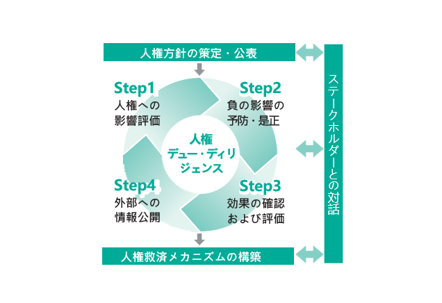 人権DDの仕組みを通じて、ステークホルダーの人権を守り、持続可能な企業活動を推進します。事業活動やサプライチェーンを通じた人権への影響評価、負の影響の予防・是正、効果の確認および評価、外部への情報公開を経営層の責任のもと、継続して取り組んでいきます。